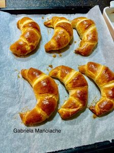 Se dezgheață aluatul, îl tăiem în triunghiuri. Punem câte o linguriță de cremă de ciocolată și rulăm. Le așezăm în tavă le ungem cu ou și dăm la cuptor până se rumenesc frumos.