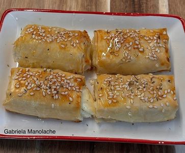 Ingrediente (pentru 4 porții): • 200 g brânză feta (1 bloc, nu fărâmițată) • 1 pachet foietaj (sau 4 foi subțiri de plăcintă/phyllo) • 2-3 linguri miere • 1 ou bătut (pentru uns foietajul) • susan alb (opțional, pentru presărat deasupra) • cimbru Mod de preparare: 1. Pregătirea feta: Taie brânza feta în bucăți groase, dreptunghiulare (cam cât un baton de ciocolată mic). 2. Împachetarea: Învelește fiecare bucată în foietaj sau 1-2 foi subțiri de plăcintă, ca pe un pachețel. Sigilează bine marginile. 3. Coacerea: Așază pachețelele într-o tavă tapetată cu hârtie de copt, unge cu ou bătut și presară puțin susan. Coace la 190°C, 20-25 minute, până se rumenesc frumos. 4. Finalizarea: Scoate din cuptor, pune pe farfurii, toarnă miere din belșug deasupra și presară puțin cimbru. 5. Servirea: Se mănâncă imediat, cât sunt calde și foietajul crocant.